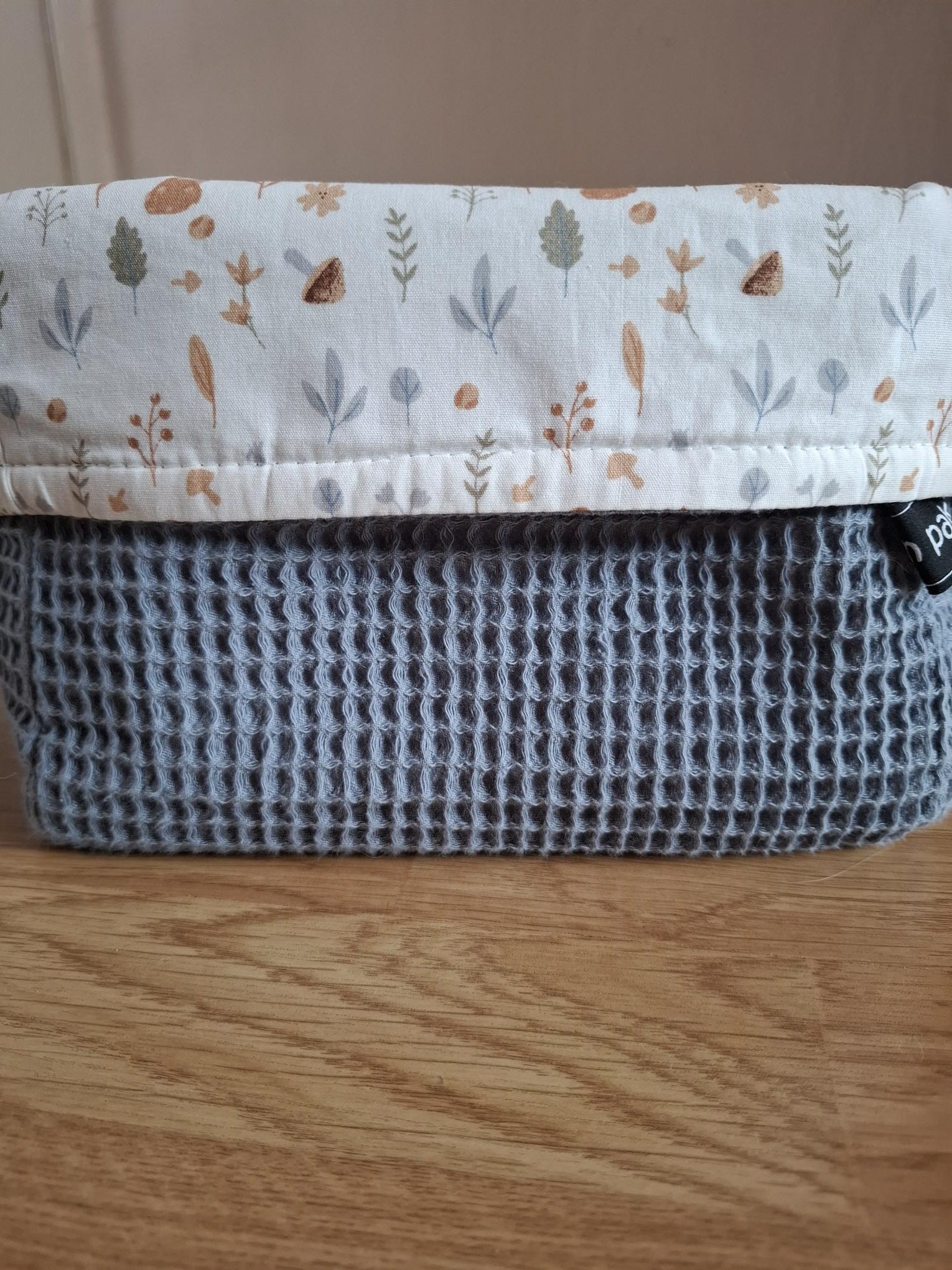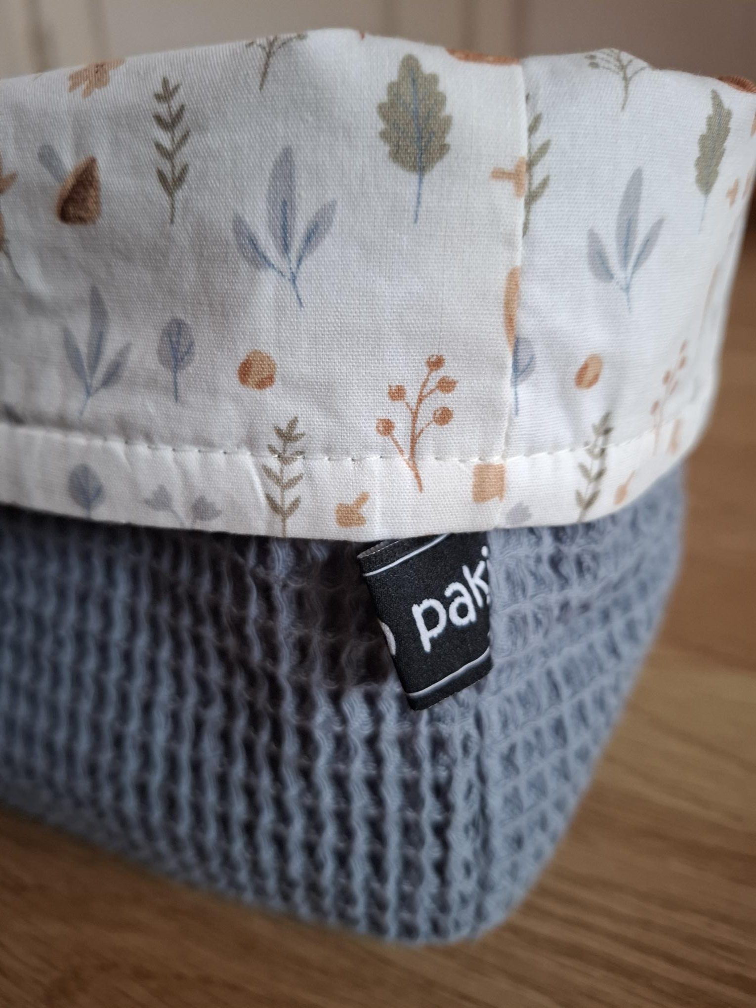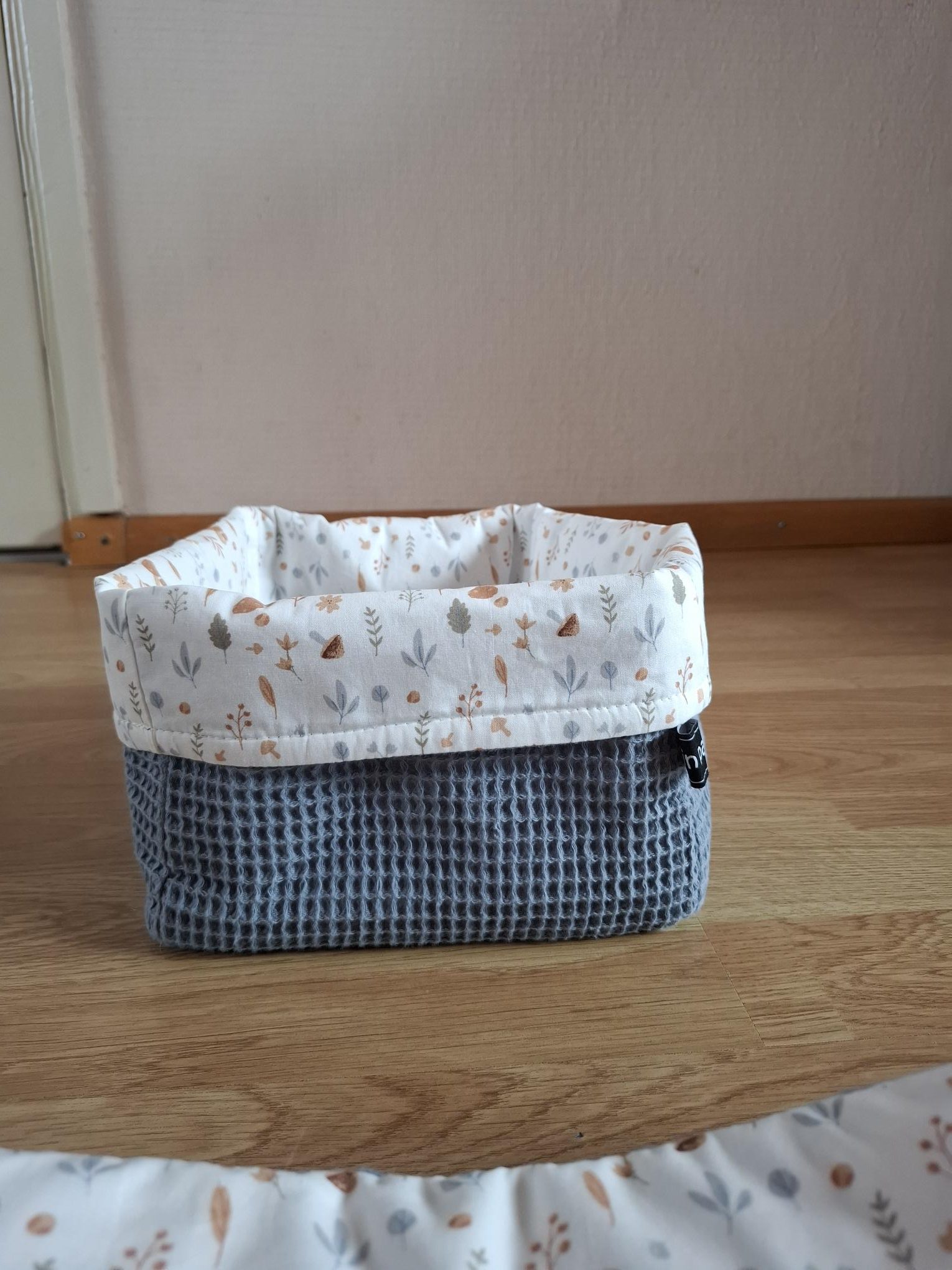 Materiaal: Wafelstof jeansblauw (100% katoen) en perzik blaadjes en paddestoeltjes herfstprint (100% katoen). De mandjes hebben een verstevigde binnenkant, zodat ze mooi rechtop blijven staan.