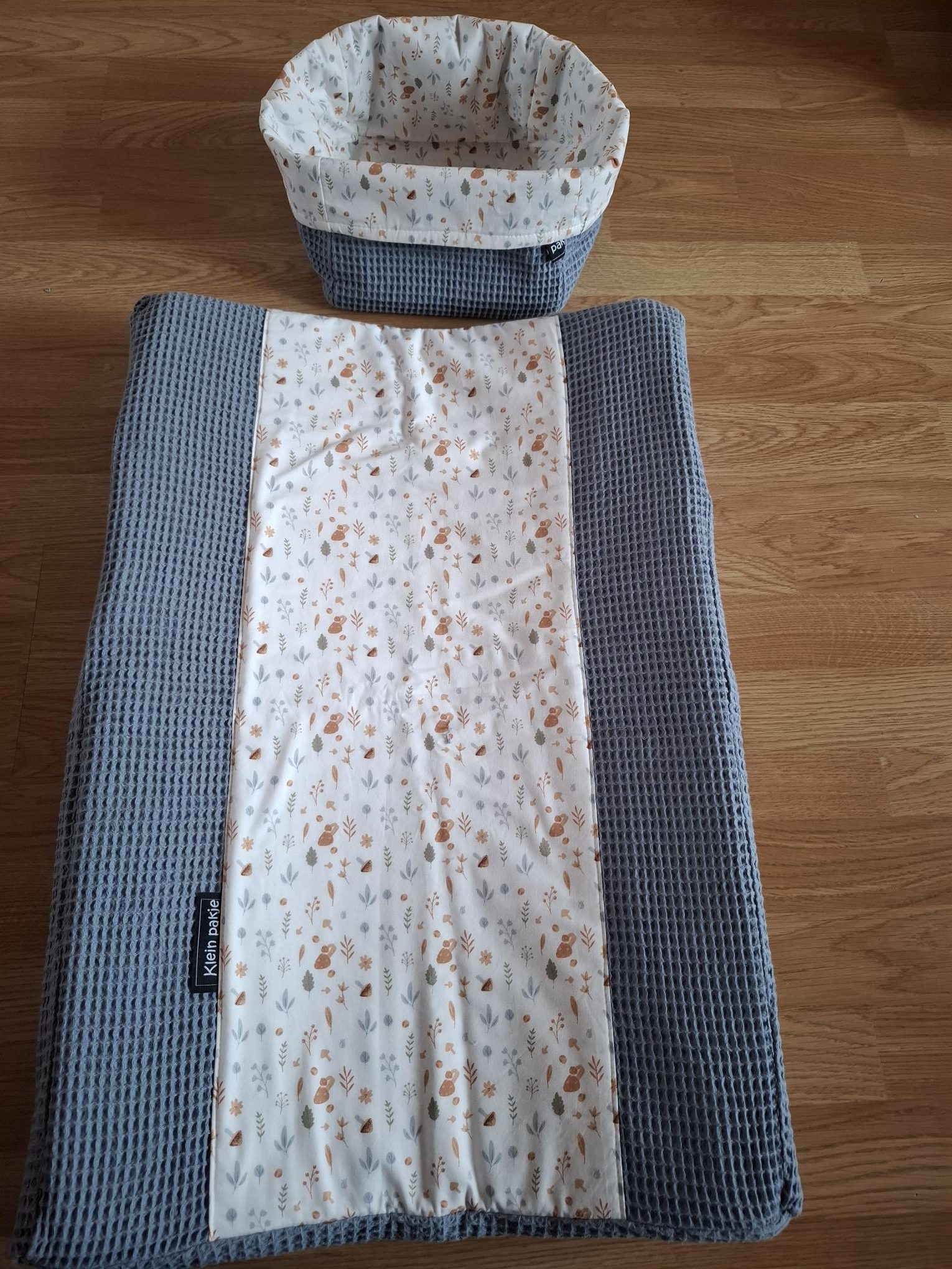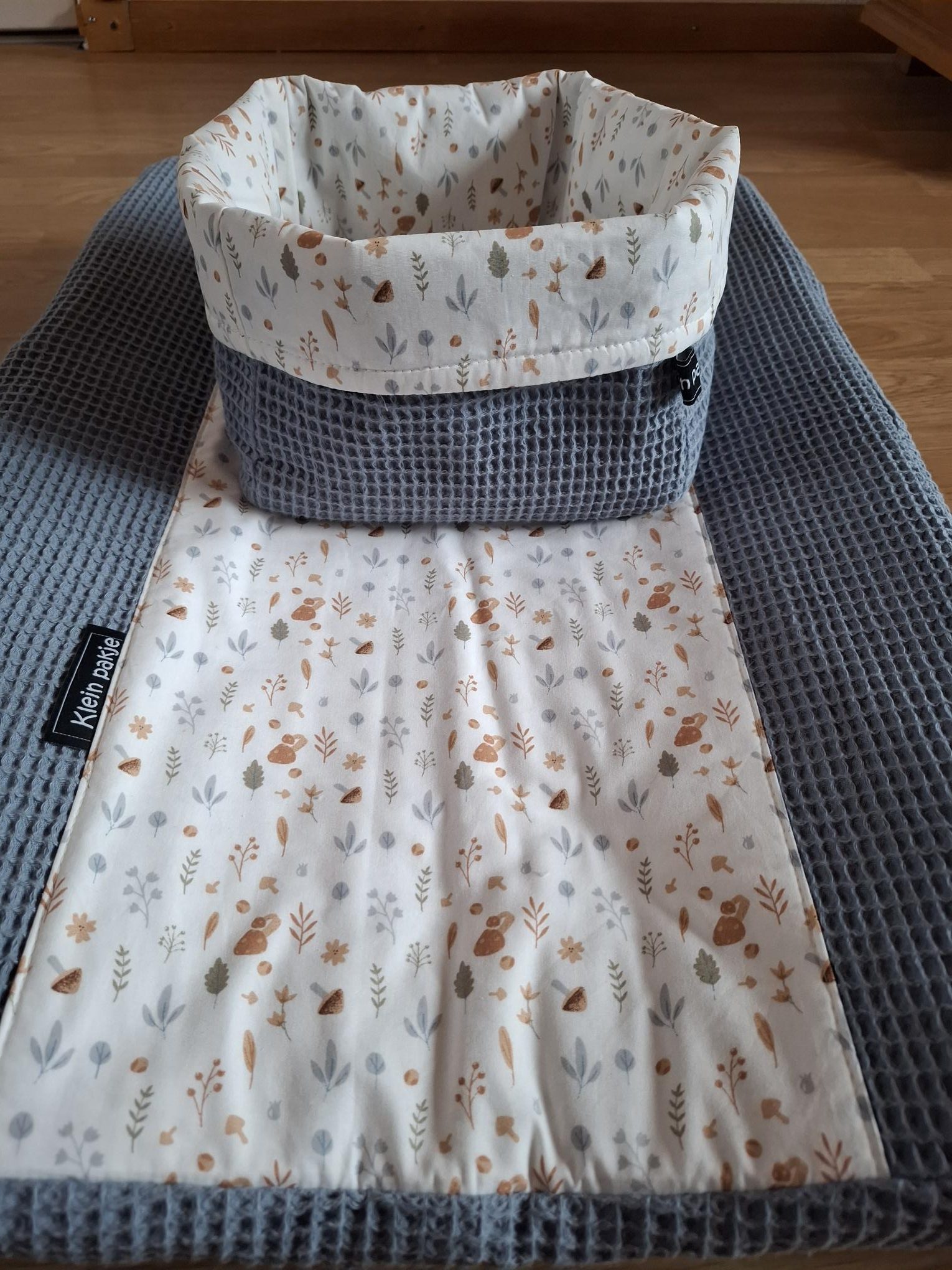 Mooi om je babykamer af te stylen: een aankleedkussenhoes en commodemandje in de door jouw gewenste kleuren. De aankleedkussenhoes en het commodemandje zijn gemaakt van jeansblauwe wafelstof (100 % katoen) en de middelste baan van perzik blaadjes en paddestoeltjes herfstprint(100 % katoen). De hoes is aan de achterkant afgewerkt met elastiek, waardoor deze mooi om het aankleedkussen sluit.